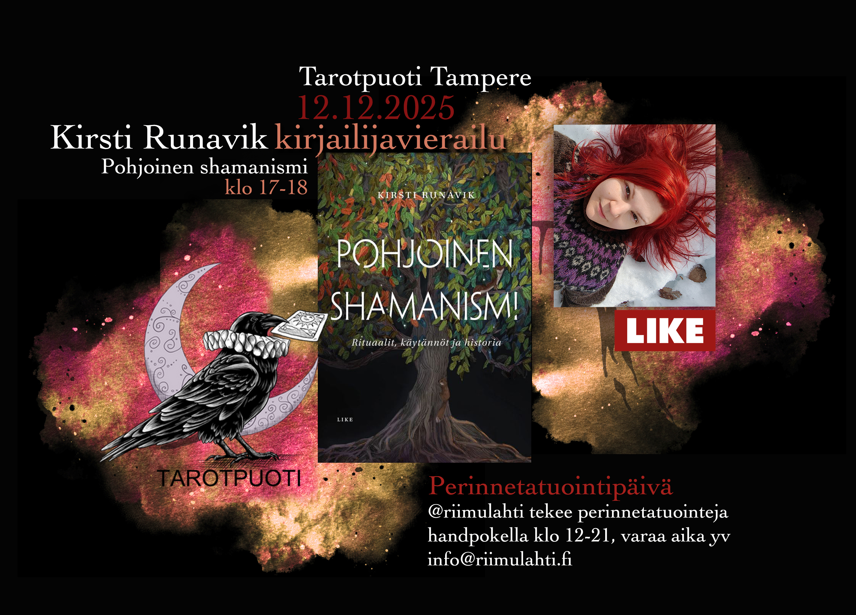 PERINNETATUOINTEJA & RIIMUKIRJAN ETKOT 28-29.11. Porin Tarotpuodilla Kirsti Runavikin Pohjoiset riimut -kirja ilmestyy helmikuussa 2026 (Like). Kirsti kertoo tulevasta kirjasta Tarotpuodin kirjaetkoilla klo 18 ja opastaa erilaiseen tapaan riimujen viisautta! Nostamme pohjoisen perinteen mukaiset juomakupit klo 19 ja sanomme marraskuulle heipat, samalla Kirsti opettaa Blott-perinteen ideaa PERINNETATUOINTEJA Kirsti eli Riimulahti tekee koneettomia perinnetatuointeja perjantain ja lauantain aikana ennakkoon ajan varanneille. Jos aikaa on, kuvia voi ottaa koska vaan, eli kannattaa kurkkia ovesta! Perinnetekniikka eli handpoke ei satu niin paljon kuin koneella tehty kuva. Hinnat 100e alkaen. Ajanvaraukset ja kyselyt Instagramissa yv @riimulahti tai maililla info@riimulahti.fi ![]() Kirsti Runavik & Pohjoinen shamanismi KIRJAILIJATAPAAMINEN 12.12. klo 17-18 Tarotpuoti Tampere Tule aistimaan kaamoksen ja keskitalven mystiikkaa pohjoisessa shamanismissa. Pohjolan varjoista, noituudesta ja seitdoista kertomassa Liken tietokirjailija Kirsti Runavik. Tervetuloa juttelemaan! PERINNETATUOINTEJA Kirsti RUNAVIK eli Riimulahti tekee koneettomia perinnetatuointeja ajan ennakkoon ajan varanneille klo 12-21. Jos aikaa on, voi pieniin kuviin tulla ilman varausta <3 Ajanvaraukset ja kyselyt Instagramissa yv @riimulahti tai maililla info@riimulahti.fi Huom! Sivuston tekstit ja kuvat ovat tekijänoikeuslain alaisia. Ilman lupaa kopioiminen on kielletty. Lyhyitä lainauksia tehdessä on kohteliasta mainita lähteenä sivuston nimi. |
